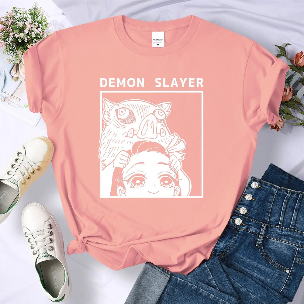 Demon Slayer Kamado Nezuko And Hashibira Inosuke T-Shirts Women Loose New Clothes Harajuku Street Tee Personality O-Neck T Shirt